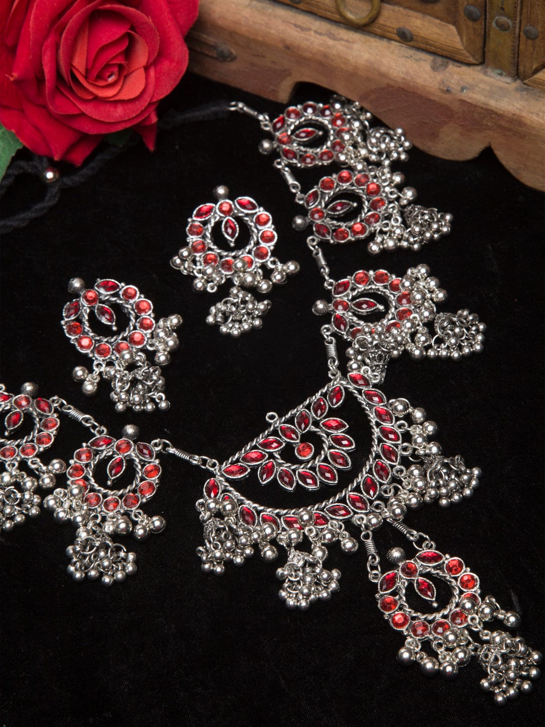 Silver-plated oxidised necklace has red stone-studded and beaded details