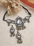 Oxidised Silver-Plated White Crystal-Studded & Pearl Beaded Jewellery Set