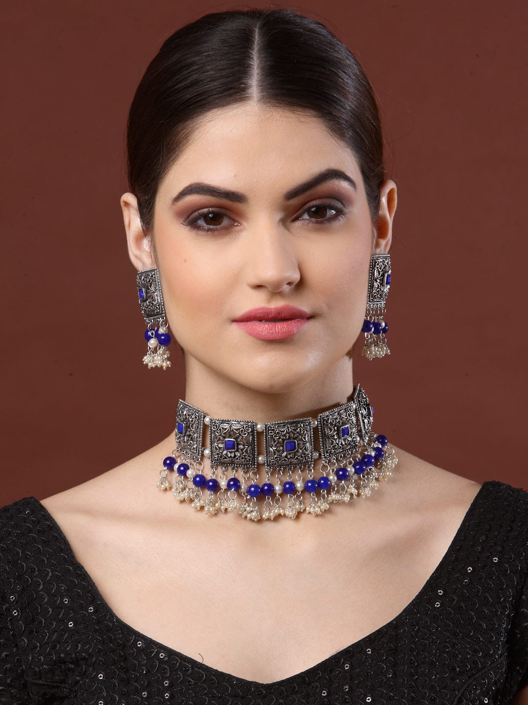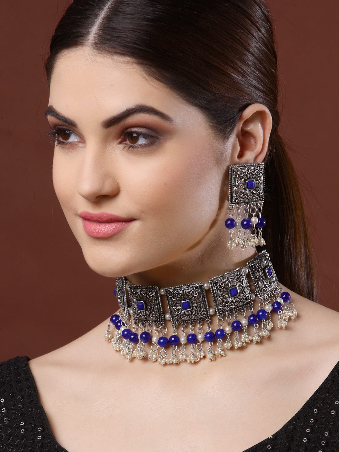 Oxidized Silver-Plated Crystal-Studded & Pearl Beaded Jewellery Set