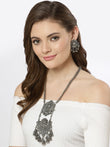 This Oxidized Silver-Plated Ghungroo-Studded & Tasselled Jewellery Set is crafted from high-quality materials for a superior finish. It features a classic oxidized silver-plating with intricate details and an array of tassels and ghungroos for a traditional and elegant look. Perfect for special occasions.