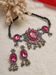 Oxidized Silver-Plated White & Pink Crystal-Studded & Pearl Beaded Jewellery Set