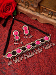 Beads & Stones Embroidered Floral Tassell Design Silver Plated Handcrafted Choker Necklace and Drop Earrings,
