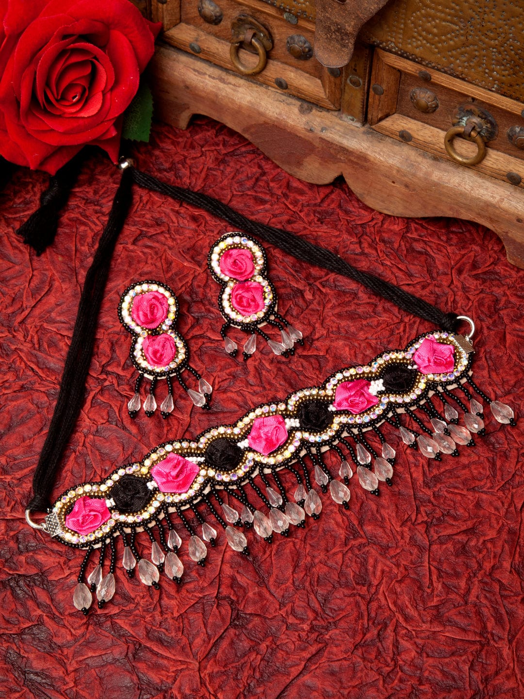 Pink & Black Silver Plated Beads & Stones Floral Handcrafted Jewellery