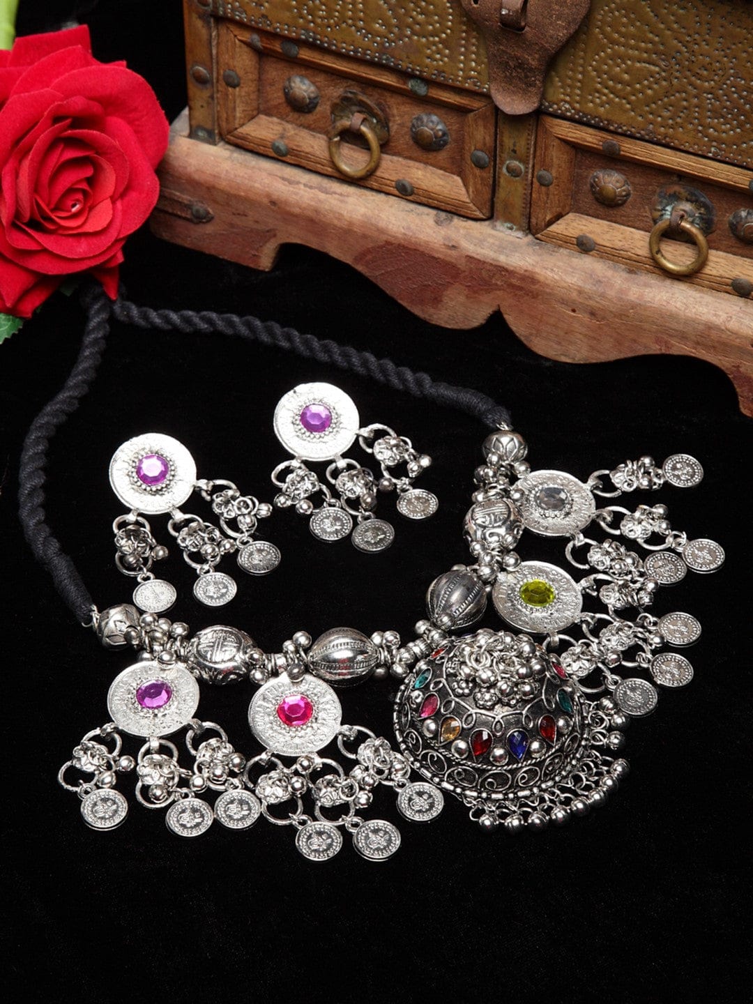 Oxidised silver-plated pink, blue and yellow stone studded handcrafted Afghan necklace with intricate detail, secured with a drawstring closure