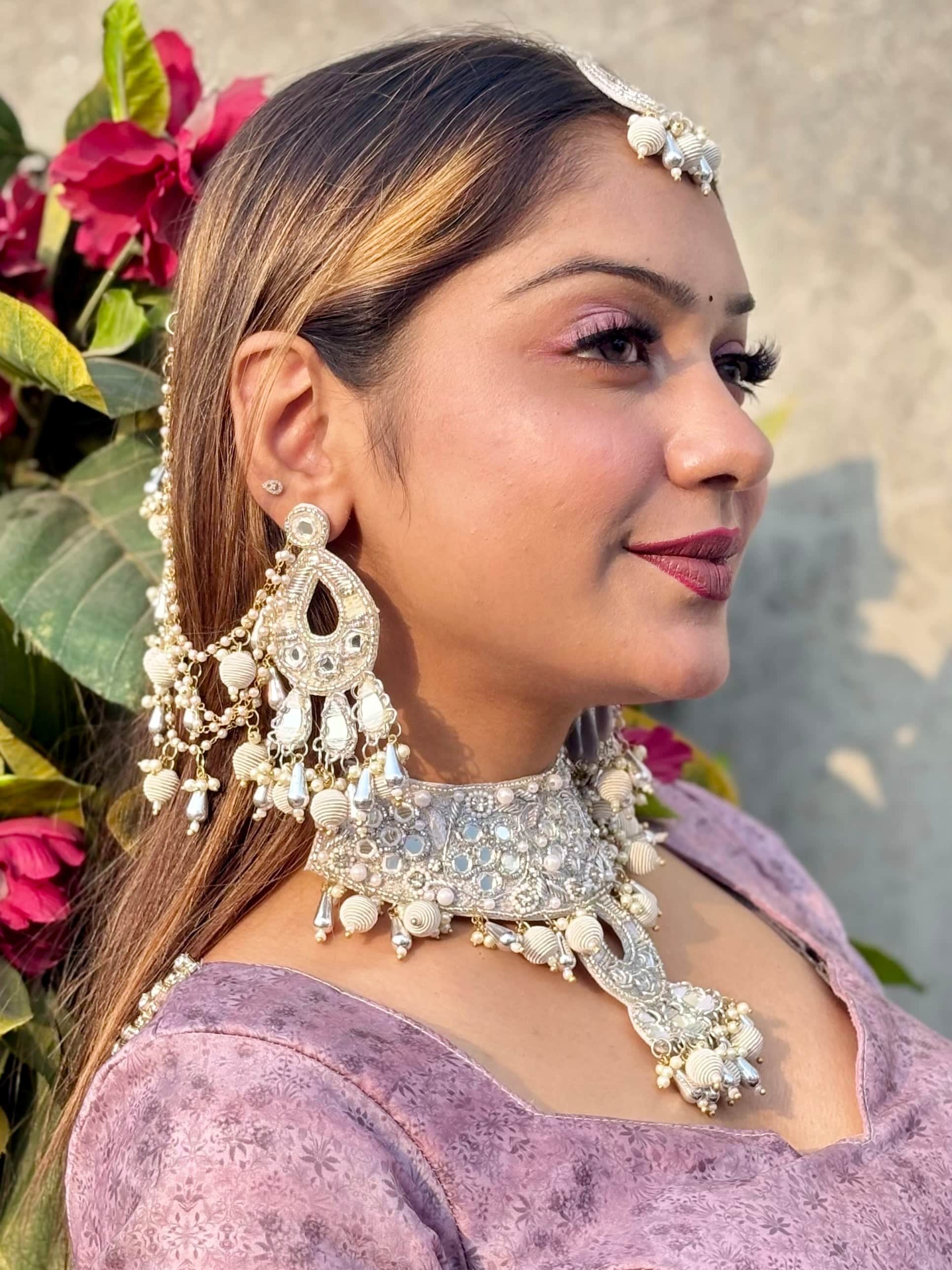 Includes necklace, earrings with detachable kaanchain (sahara)& maangtika