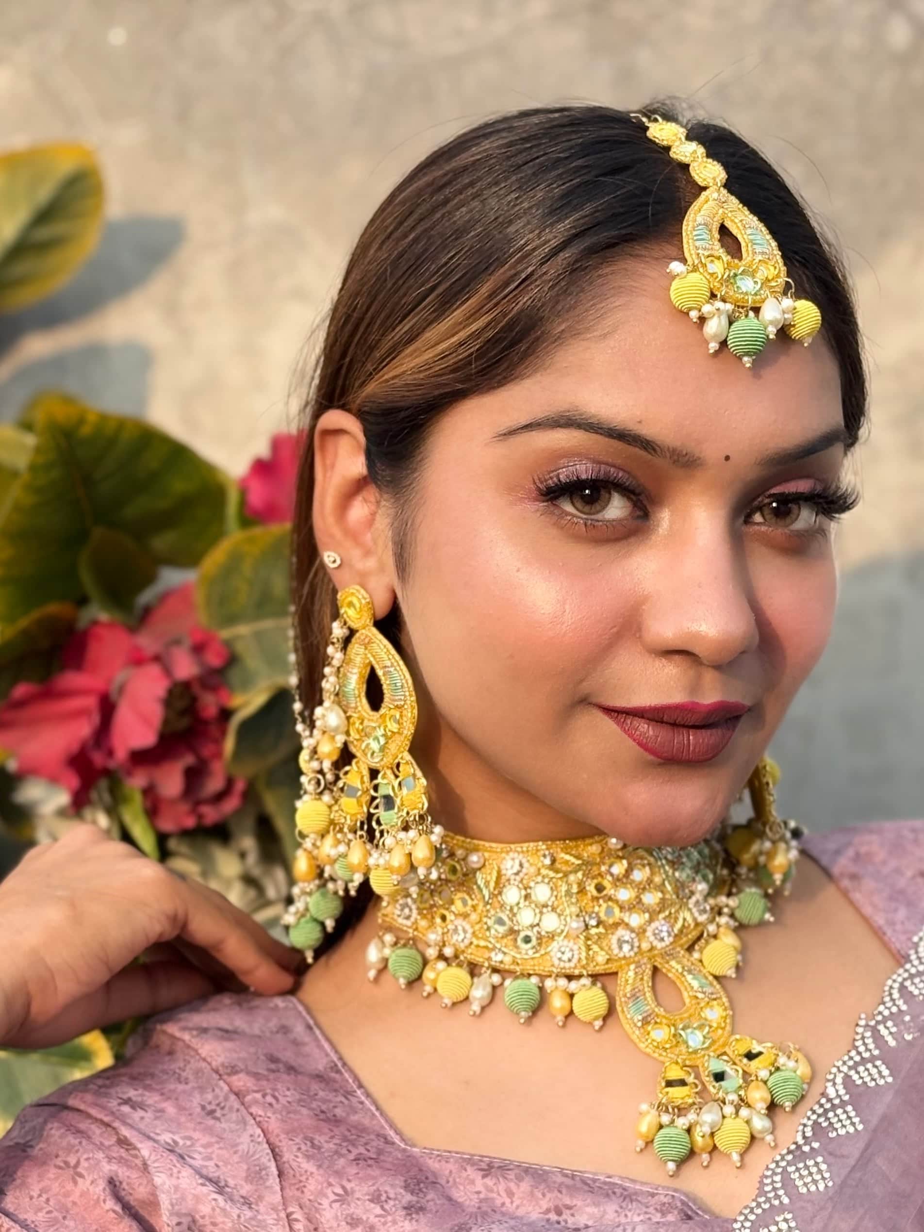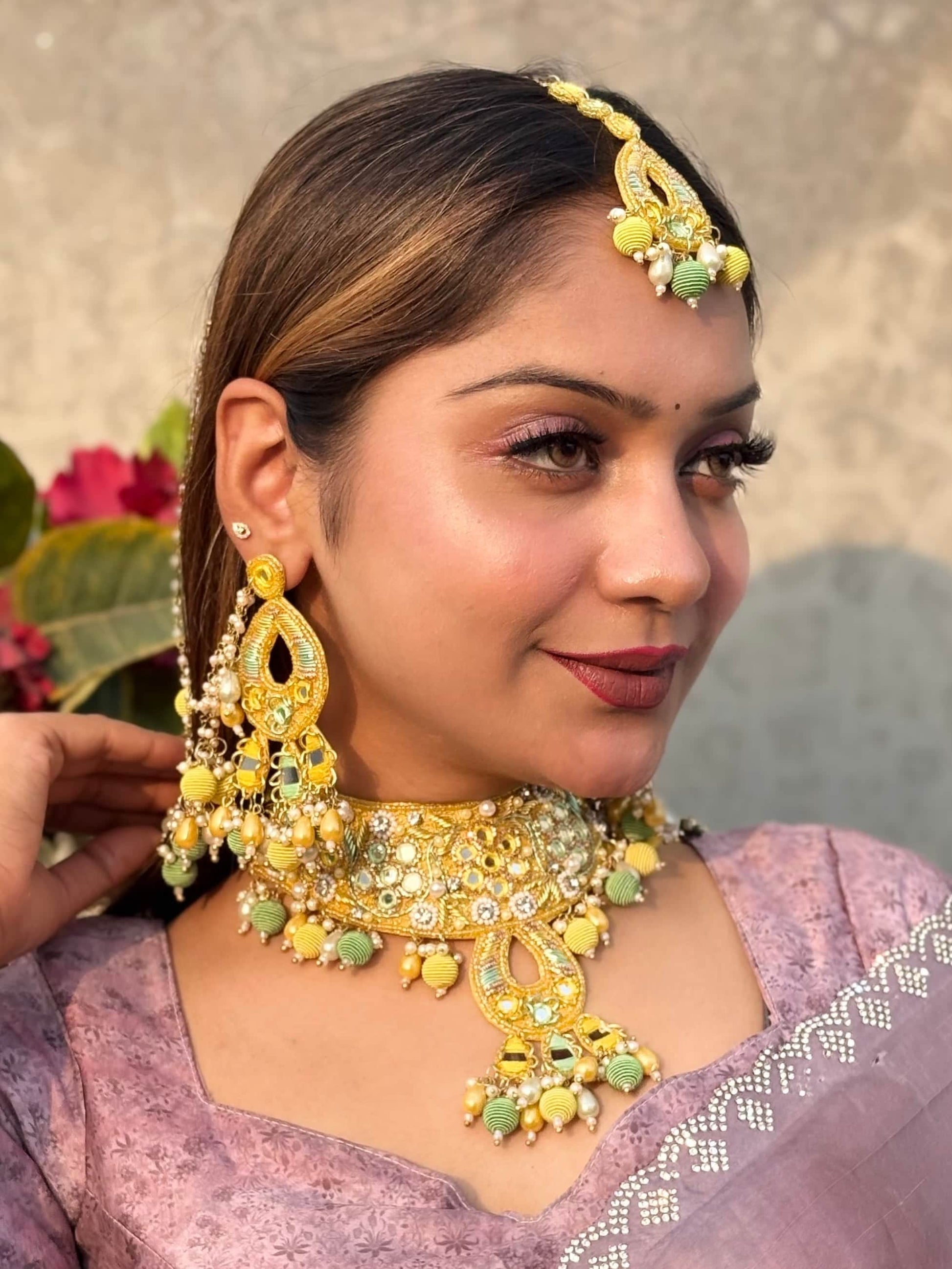 Each piece showcases intricate craftsmanship and minute detailing, making it more than just an accessory—it’s a celebration of vibrant tradition and modern elegance. The multicolour accents add a playful yet graceful charm, perfect for festive occasions, haldi, mehndi, weddings, or special celebrations.