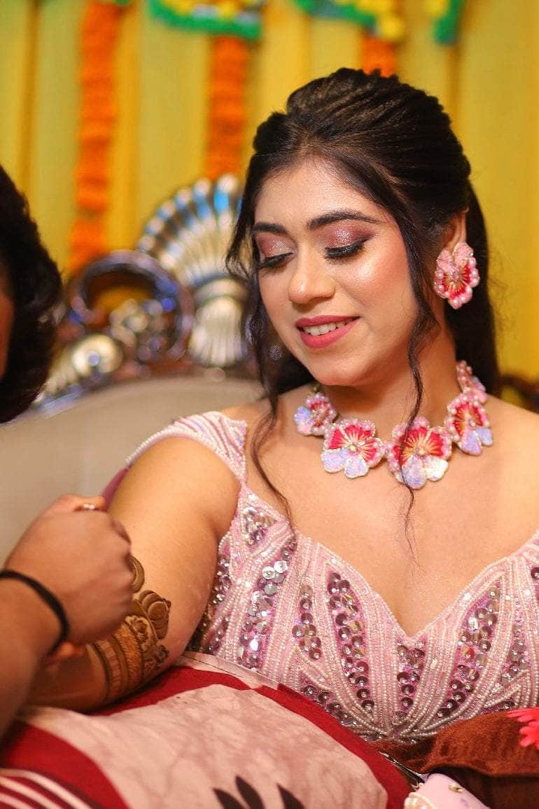 Add a touch of handcrafted charm to your haldi or mehndi look with this stunning floral necklace set, beautifully designed with premium quality beads and resham work. Each petal is intricately detailed to reflect the freshness of blooming flowers, while the vibrant hues and shimmer bring out your festive glow.