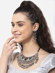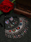 Meenakari Work Afghan Tasselled Design Oxidised Silver Plated Handcrafted Choker Necklace and Drop Earrings,