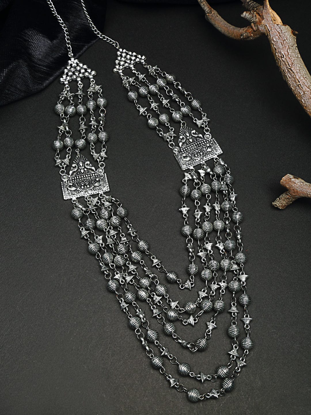 This Silver-Plated Brass Layered Necklace is a beautifully crafted statement piece, sure to enhance any outfit. It is expertly crafted with an intricate design from premium-quality silver-plated brass, offering a glossy finish and luxurious look. Perfect for special occasions or everyday wear, this elegant necklace will become a wardrobe staple.