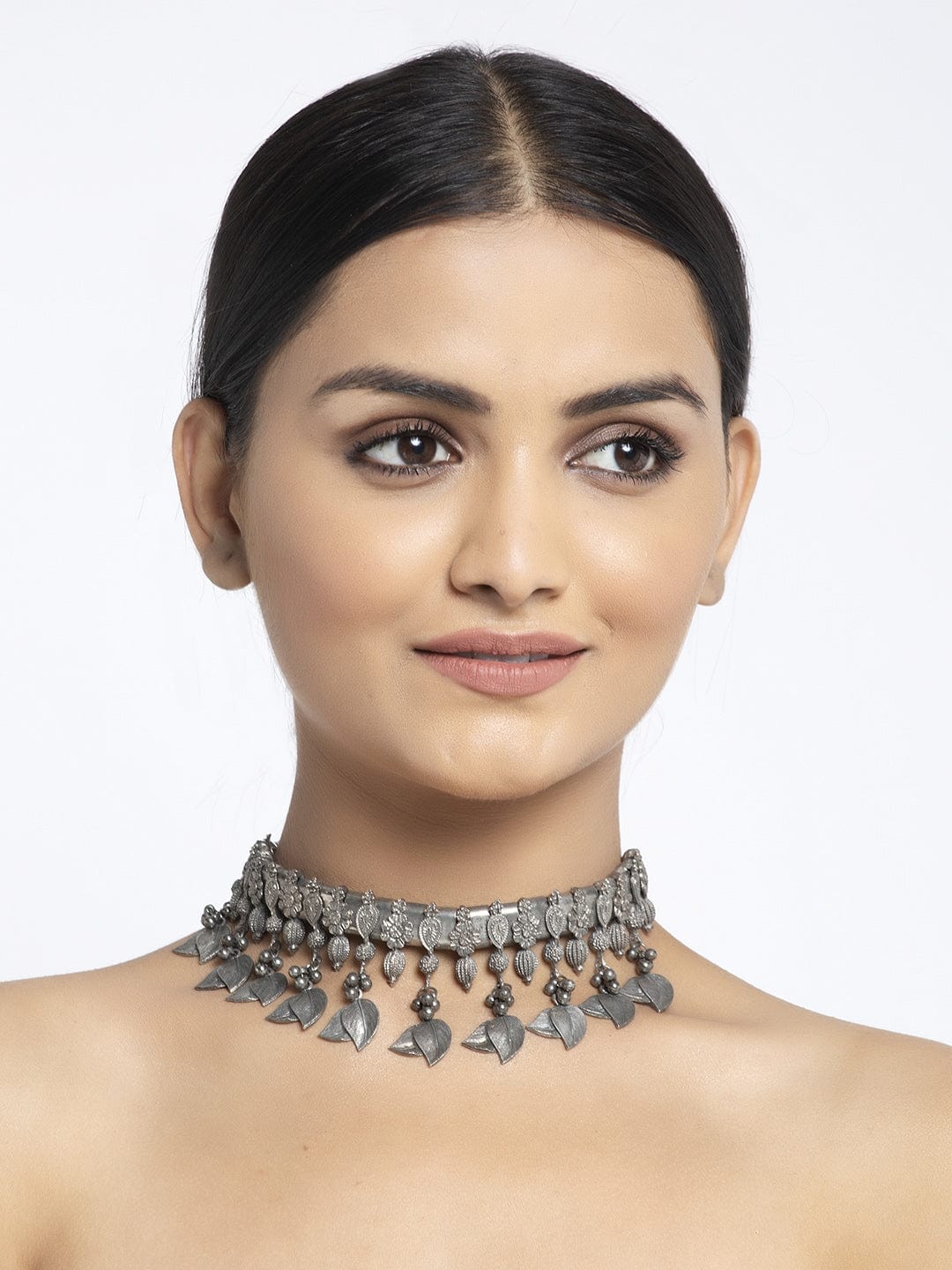 This beautiful Silver-Plated Brass Tribal Necklace is perfect for making a statement. The handcrafted tribal pattern is impressive and eye-catching, and the quality brass and silver-plating ensures its durability. Add a touch of class and elegance to any outfit with this timeless piece.