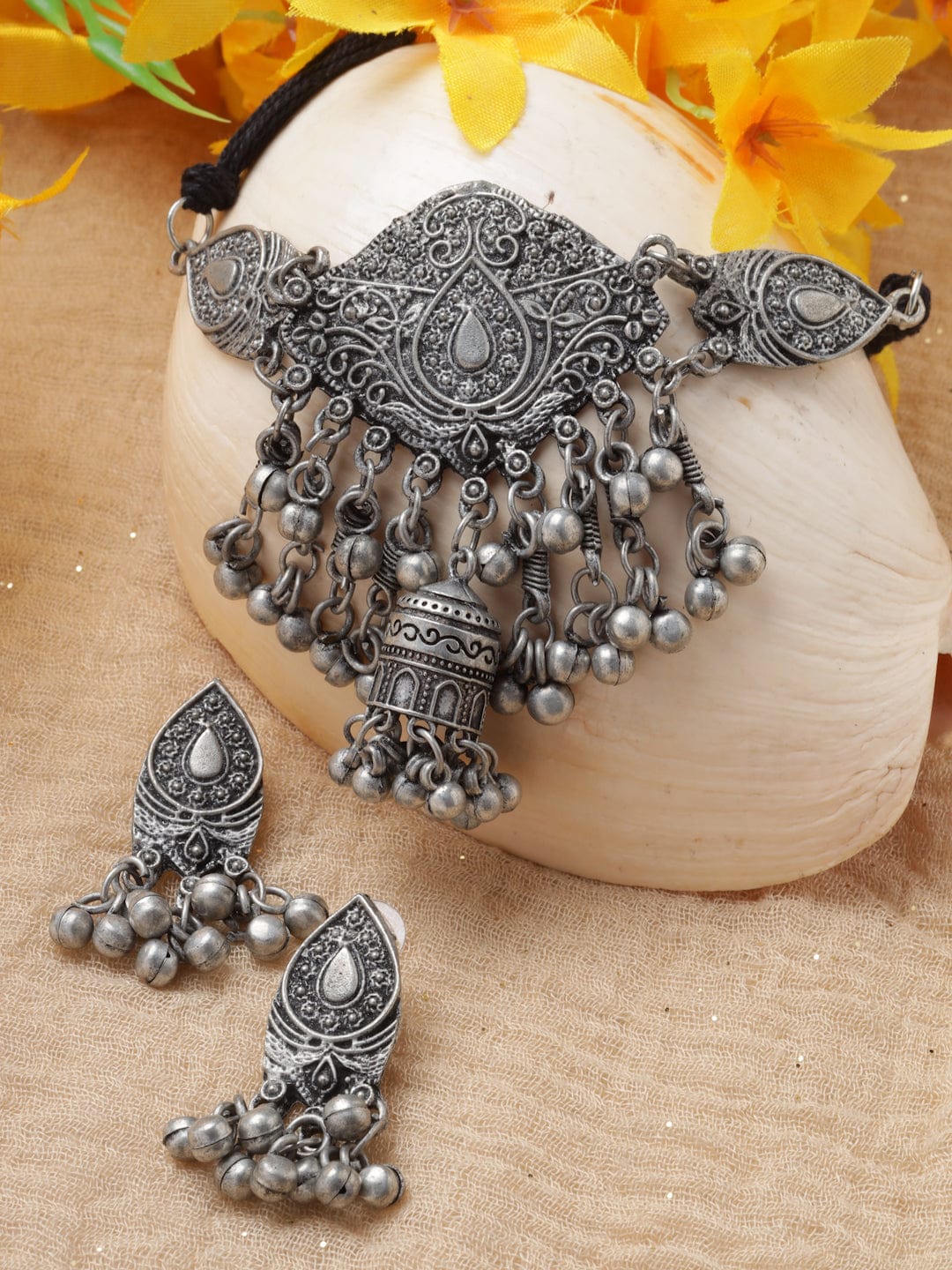 Silver-Plated Ghungroo-Studded & Beaded Oxidised Jewellery Set