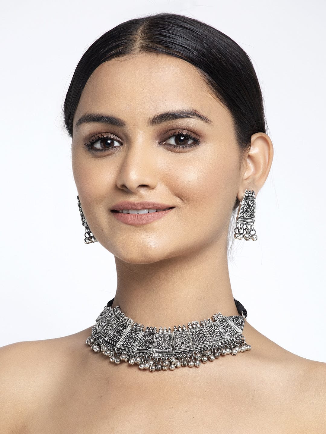 Silver-plated tribal choker necklace, has intricate textured design and ghungroo beaded droplets, secured with an adjustable draswtring fastening