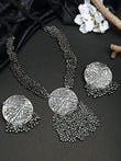 Silver-plated ghungroo studded tasseled tribal necklace with circular detailing, secured with drawstring closure
