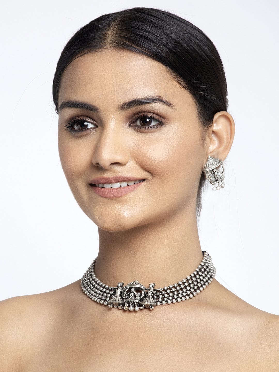 This exquisite jewellery set is crafted with a silver plating and antique design, presenting a timeless look that is both elegant and sophisticated. The high-quality craftsmanship ensures a beautiful and durable piece of jewellery that is sure to be a favorite for years to come.