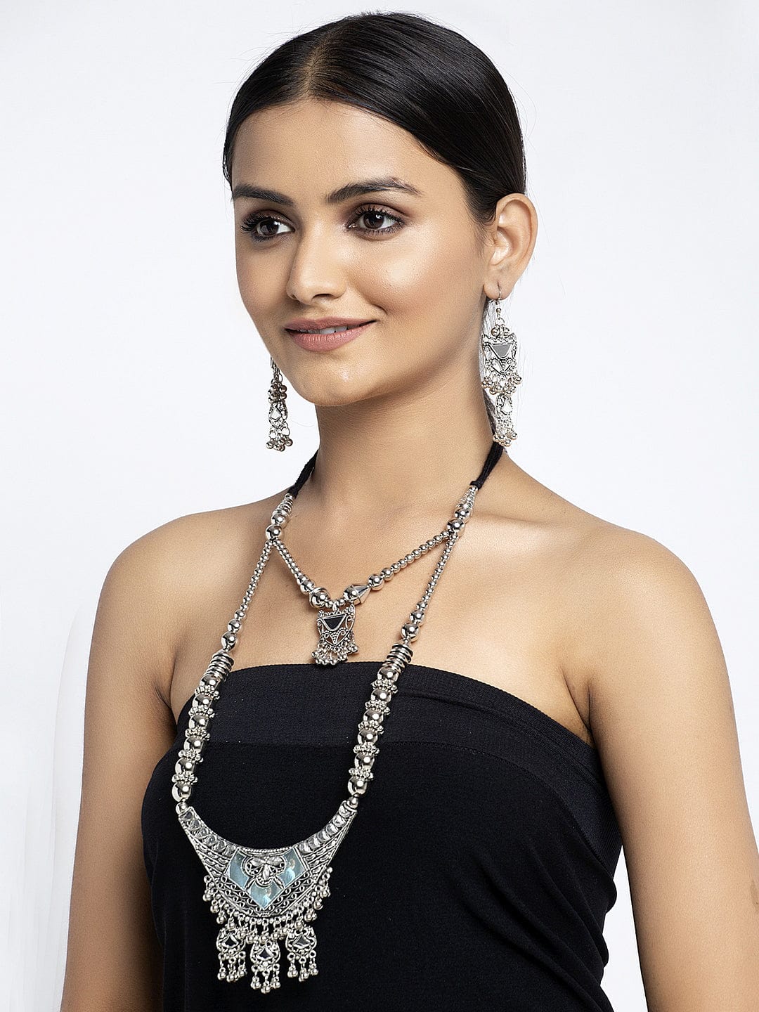 Silver-Plated Mirror & Ghungroo Studded Tribal Tasselled Design Jewellery Set