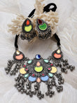 This silver-plated mirror and ghungroo tasselled jewellery set is a timeless piece you'll be able to enjoy for years to come. Featuring a vibrant mix of silver plating and intricate ghungroos, this statement set is sure to turn heads. The perfect addition to any evening wardrobe!