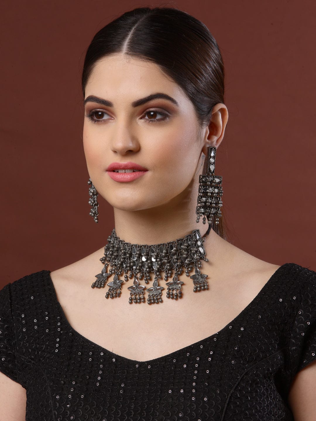 This Silver-Plated Mirrors Studded & Beaded Jewellery Set offers a timeless elegance to any look with its classic design. Crafted with exquisite detail, the set features a silver plated base, mirrors and beading that provide an elevated and timeless beauty. The perfect way to accessorise for any special occasion.