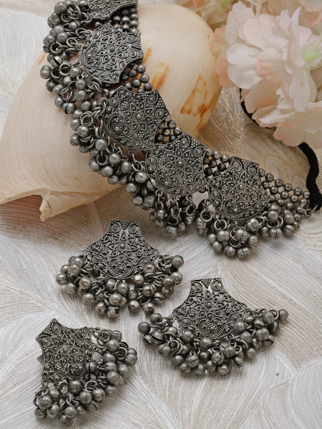Silver-Plated Oxidised Necklace & Earrings Set With Finger Ring