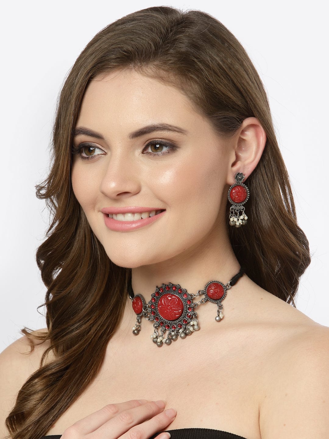 Silver-Plated Red Agate & Pearls Studded Oxidised Jewellery Set