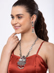 Red Stones & Pearls Studded Oxidised Silver Plated Handcrafted Tasselled Necklace and Jhumkas