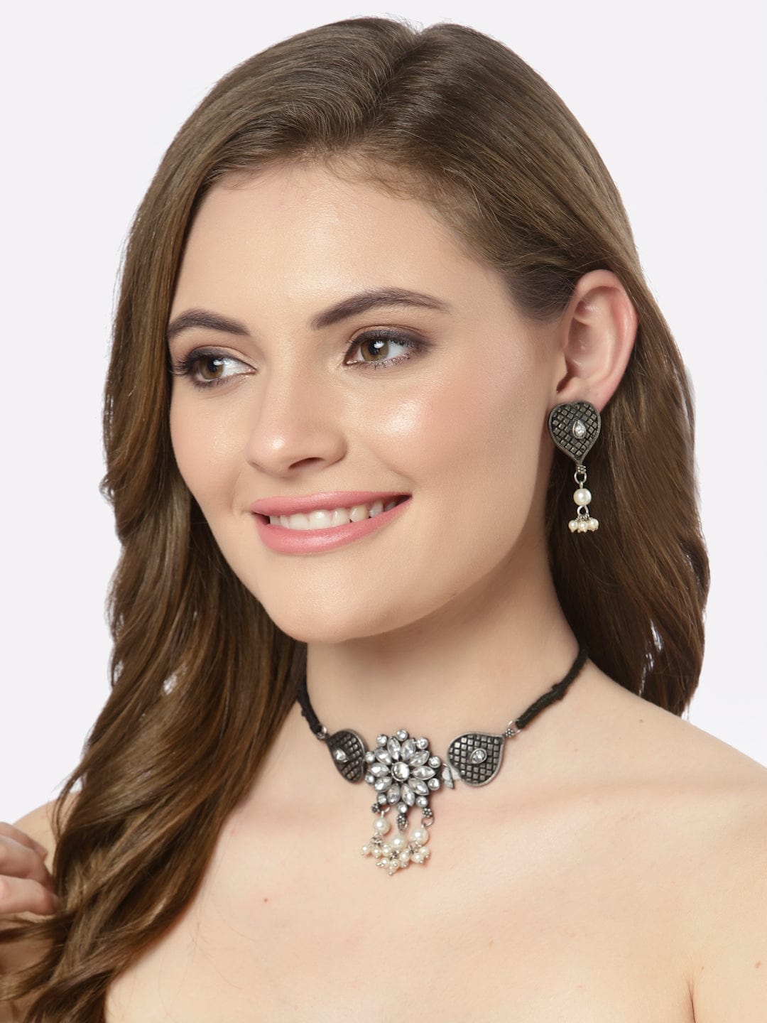 Silver-Plated White Crystal-Studded & Beaded Jewellery Set
