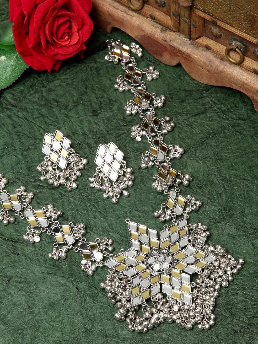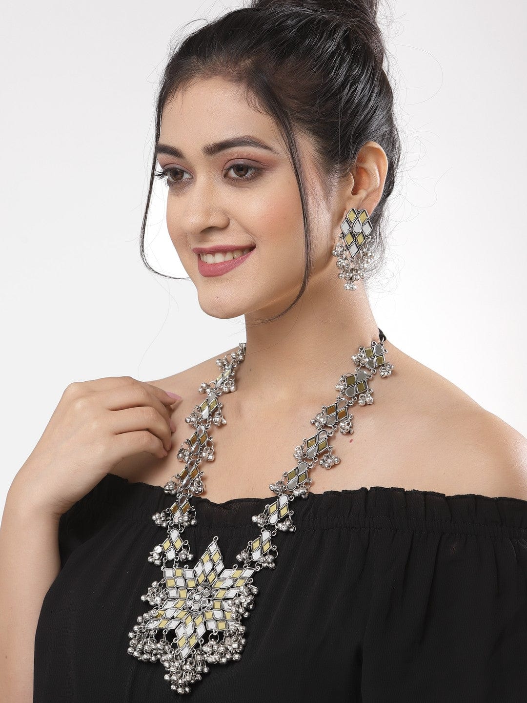 Yellow Mirrors Tasselled Floral Design Oxidised Silver Plated Handcrafted Layered Necklace and Stud Earrings