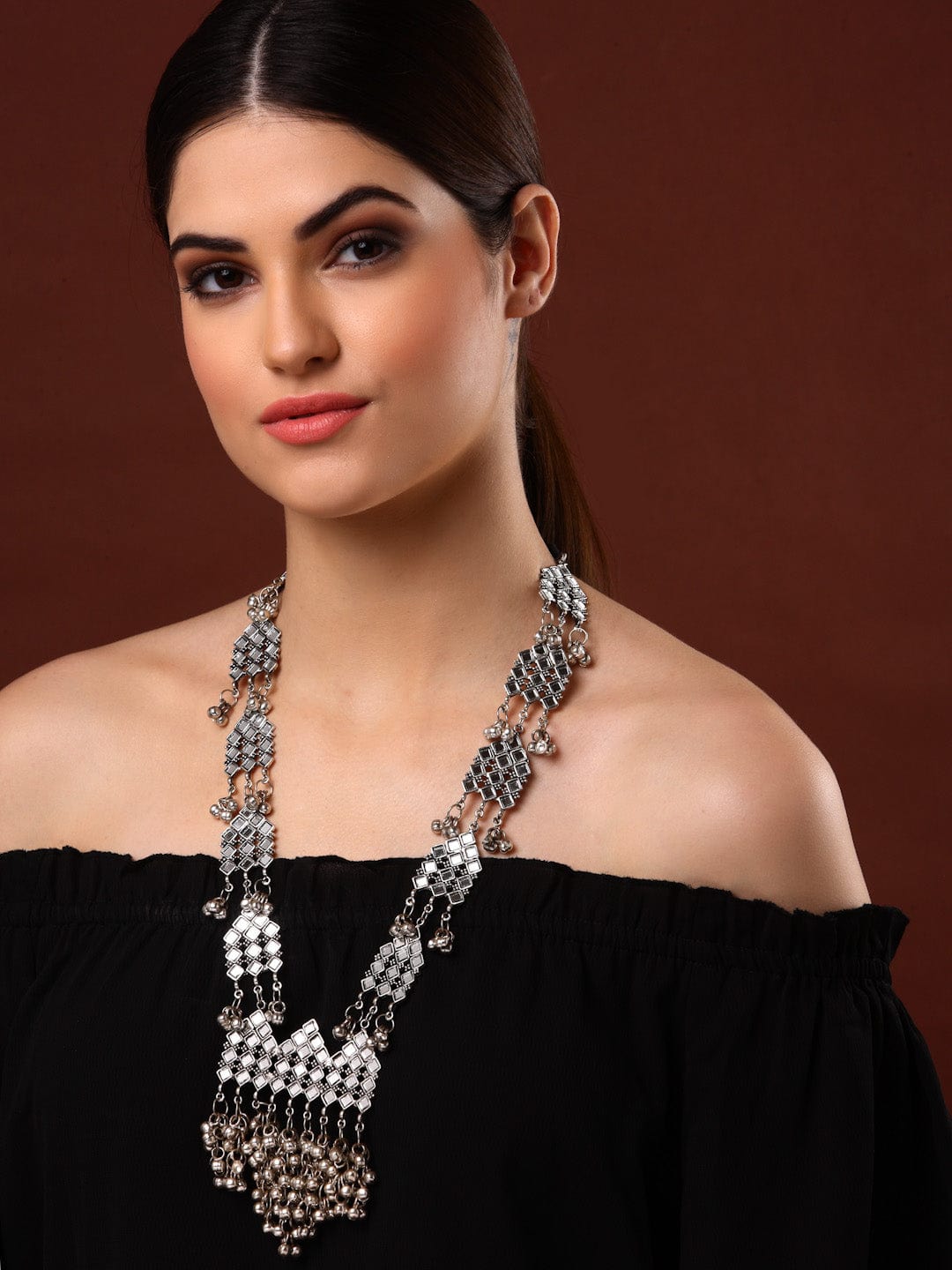 Silver-Toned & Black Brass Silver-Plated Mirror Necklace