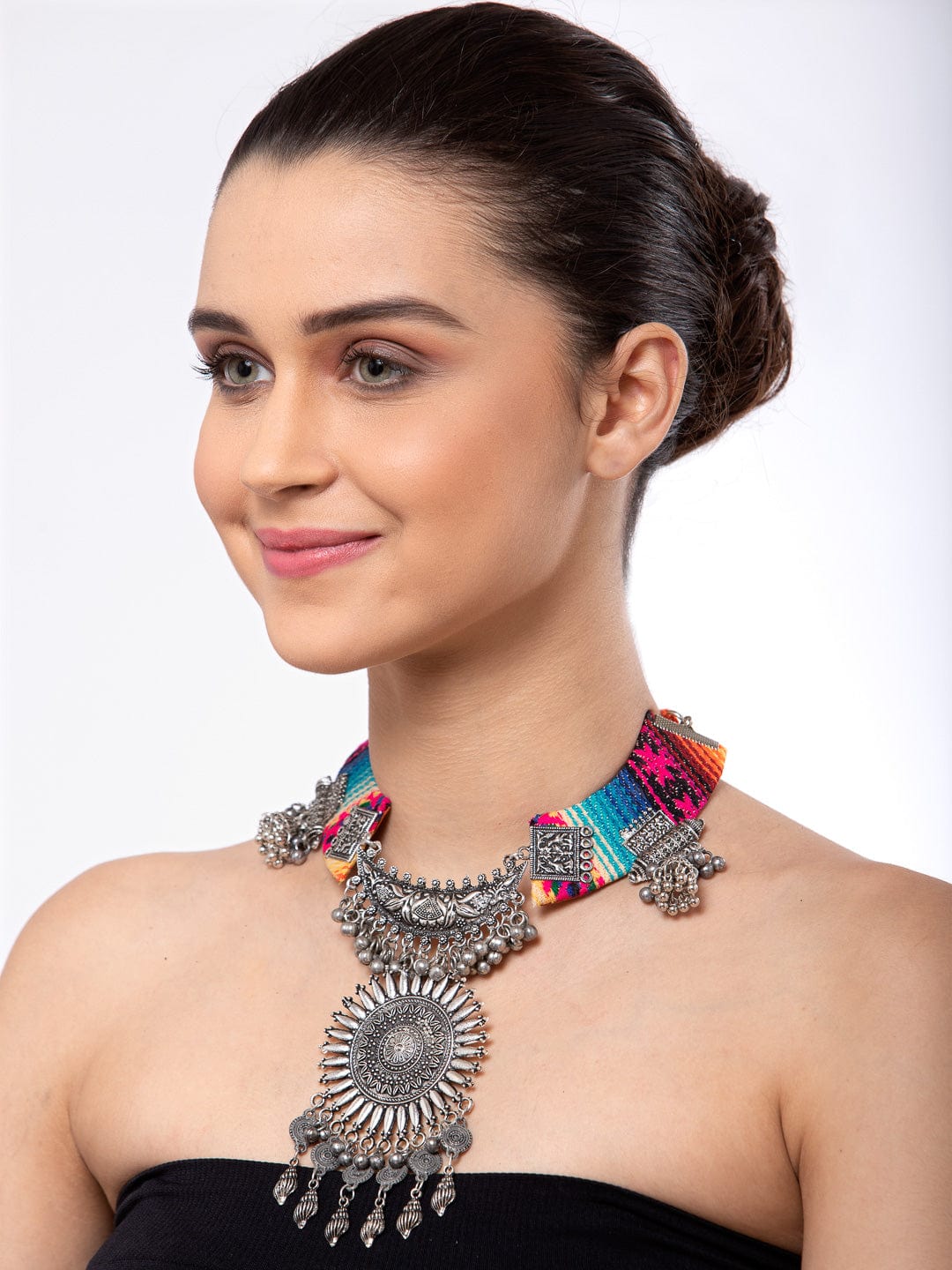 This elegant silver-toned & blue brass silver-plated handcrafted necklace is sure to be a conversation piece. Crafted with expert care and made of high-quality materials, it is sure to last. A perfect accessory for your wardrobe.