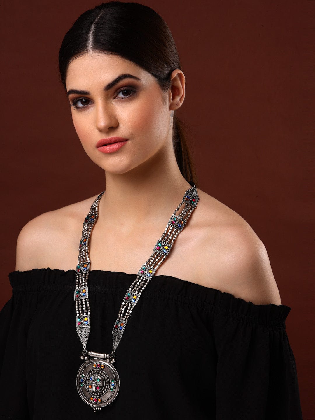 This Silver-Toned & Blue Brass Silver-Plated Oxidised Necklace is a must-have for any jewelry collection. Crafted with silver-plated brass and oxidized for a timeless look, its intricate design will add an elegant touch to your outfit. Made using high-quality materials, this beautiful necklace will last for years to come.