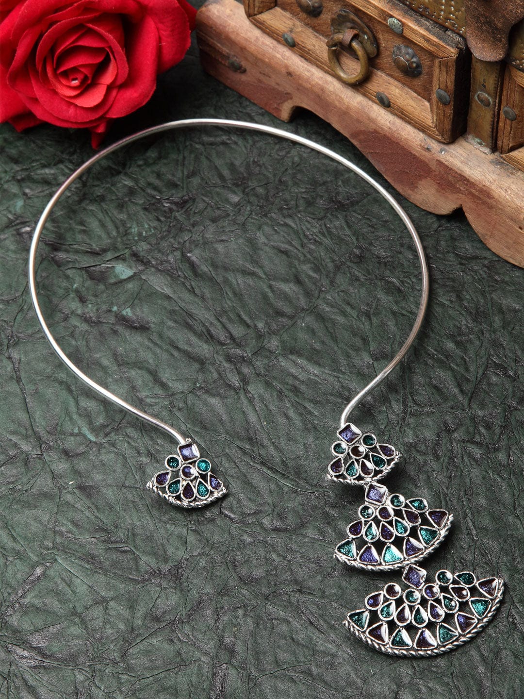 Silver-Toned & Green Brass Silver-Plated Afghan Meenakari Necklace
