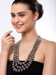 This Silver-Toned & Off White Cowri Shells Silver-Plated Tribal Oxidised Necklace is a stunning combination of tribal-style silver-plated metal links and off-white cowri shells. Its oxidized finish lends a unique texture and shine, perfect for a statement accessory.