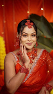 Step into your bridal glow with this lightweight handcrafted jewellery set, designed to make your special day effortlessly elegant. Adorned with intricate zardosi detailing, resham thread work, shimmering zircons, and premium beads, each piece is a masterpiece of delicate craftsmanship. The set combines regal charm with feather-light comfort—so you can ditch the heavy jewellery and celebrate your moments carefree.