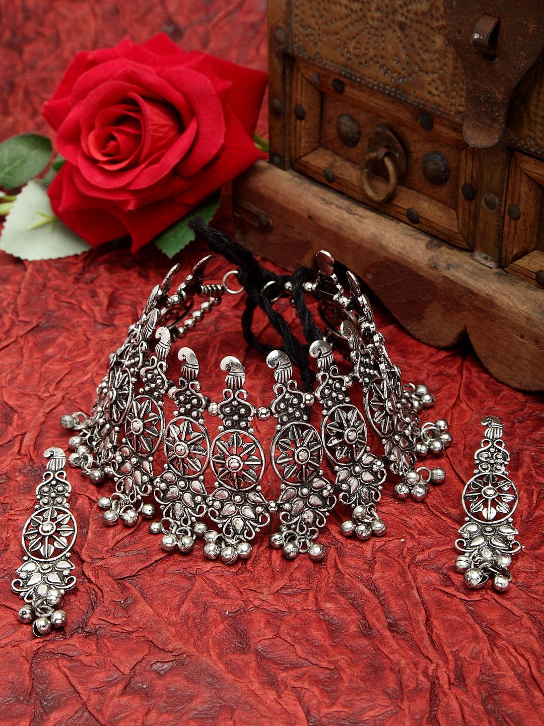 Oxidised silver-plated necklace with floral-shaped motifs, has centrepiece with intricately textured detailing and ghungroo beaded detail