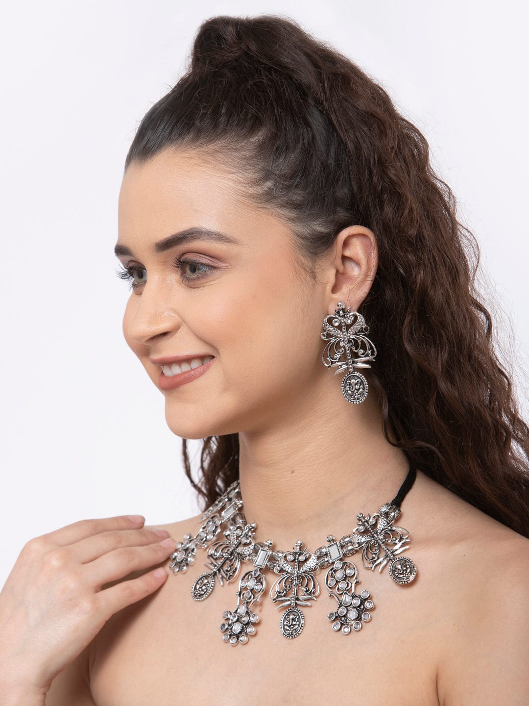Oxidised silver-plated temple necklace, has white crystal-studded detail with filigree and mirror work