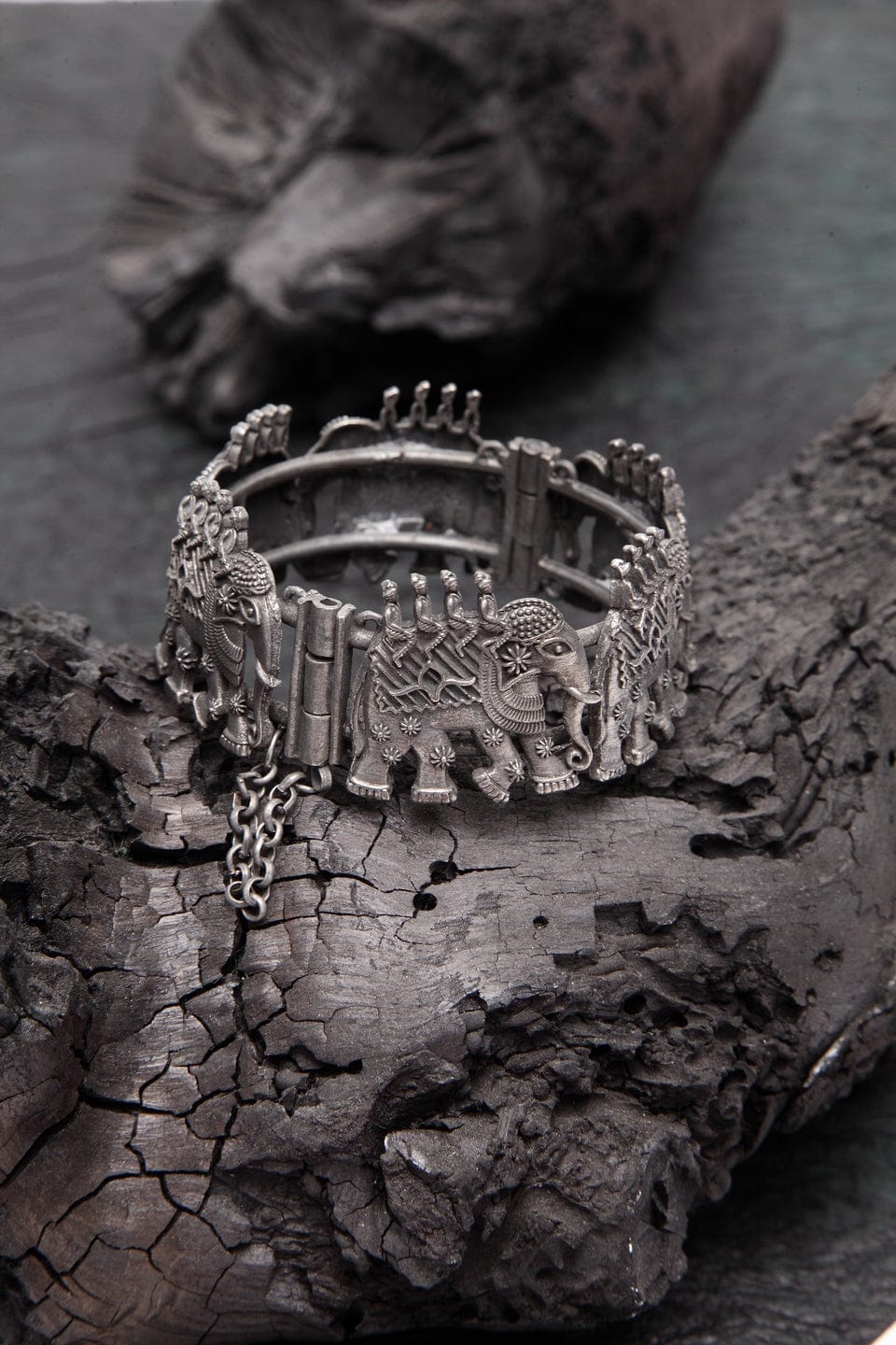 This women's gunmetal-toned silver-plated handcrafted bangle-style bracelet is perfect for any occasion. Crafted with intricate detailing and a tribal design, it adds a stylish touch to any outfit. The silver plating on the metal ensures it won't tarnish or corrode.