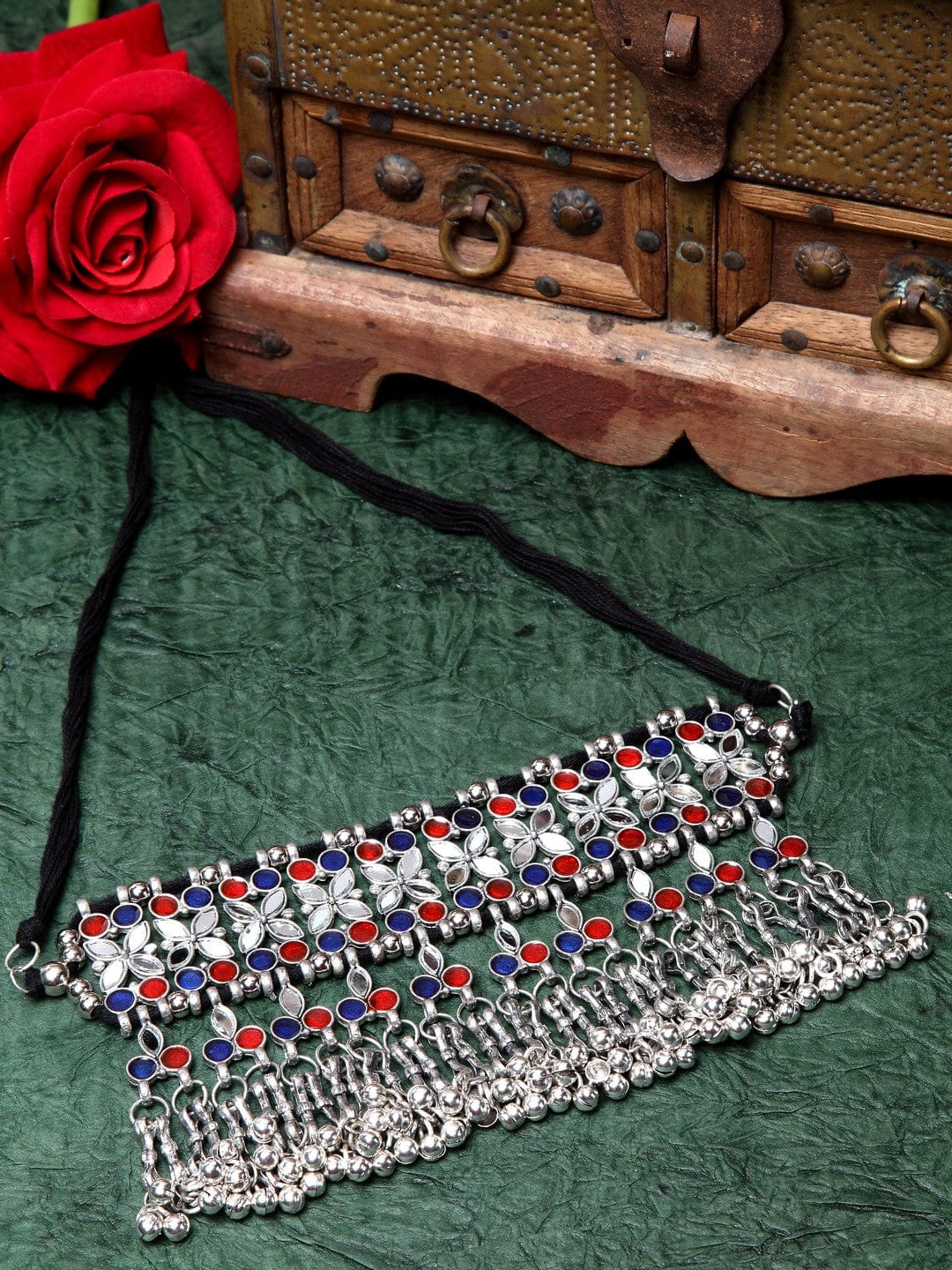 Women Red & Blue Silver-Plated Mirror Studded Tasselled Afghan Choker Necklace