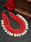 Red Bone Beads & Cowri Shells Studded Oxidised Silver Plated Tribal Necklace, Secured with a S-Hook