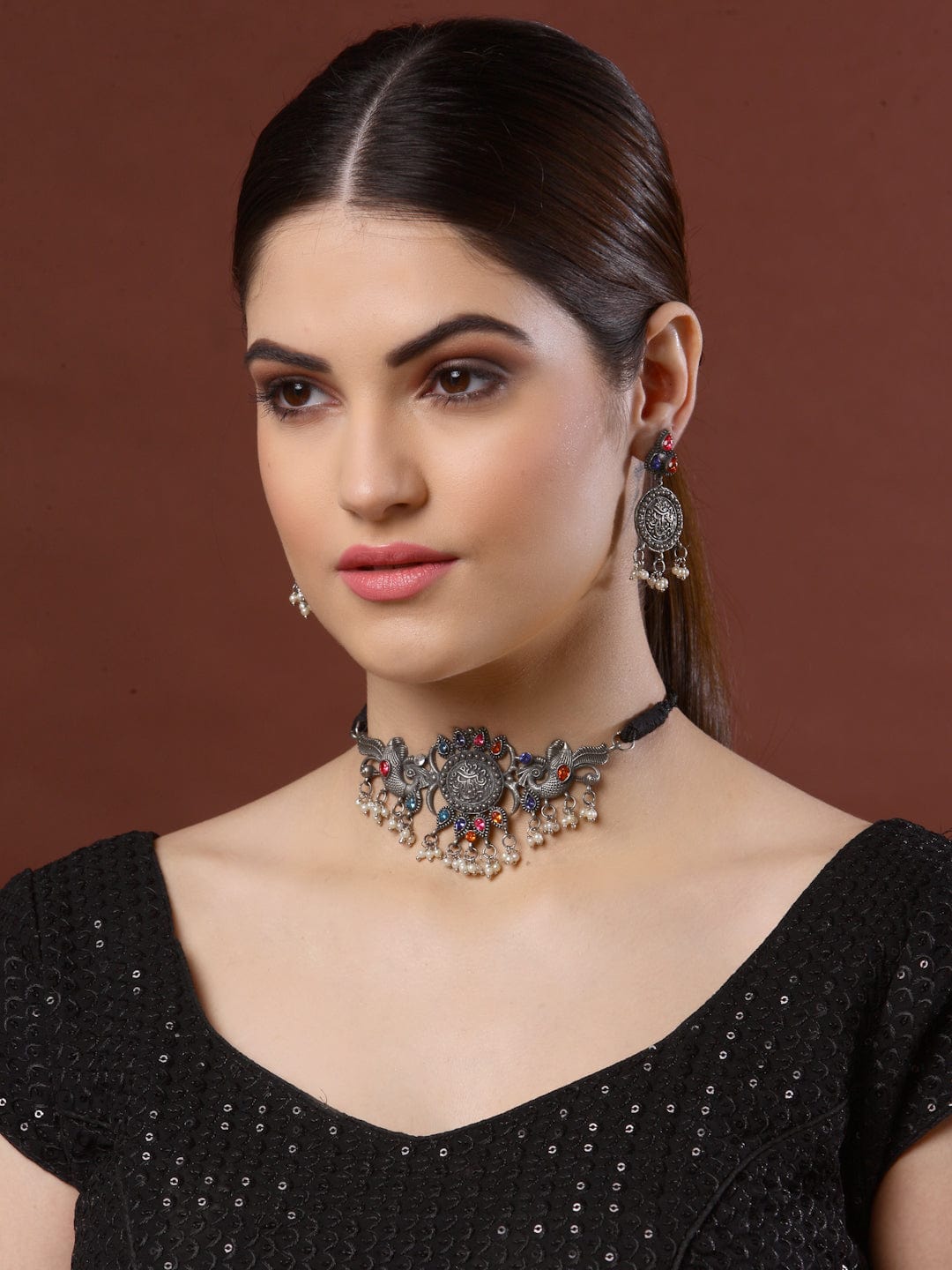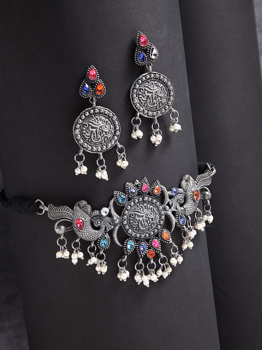 Stones & Pearls Studded Tasselled Design Oxidised Silver Plated Temple Choker Necklace and Stud Earrings, Secured with Drawstring and Push Back Closure