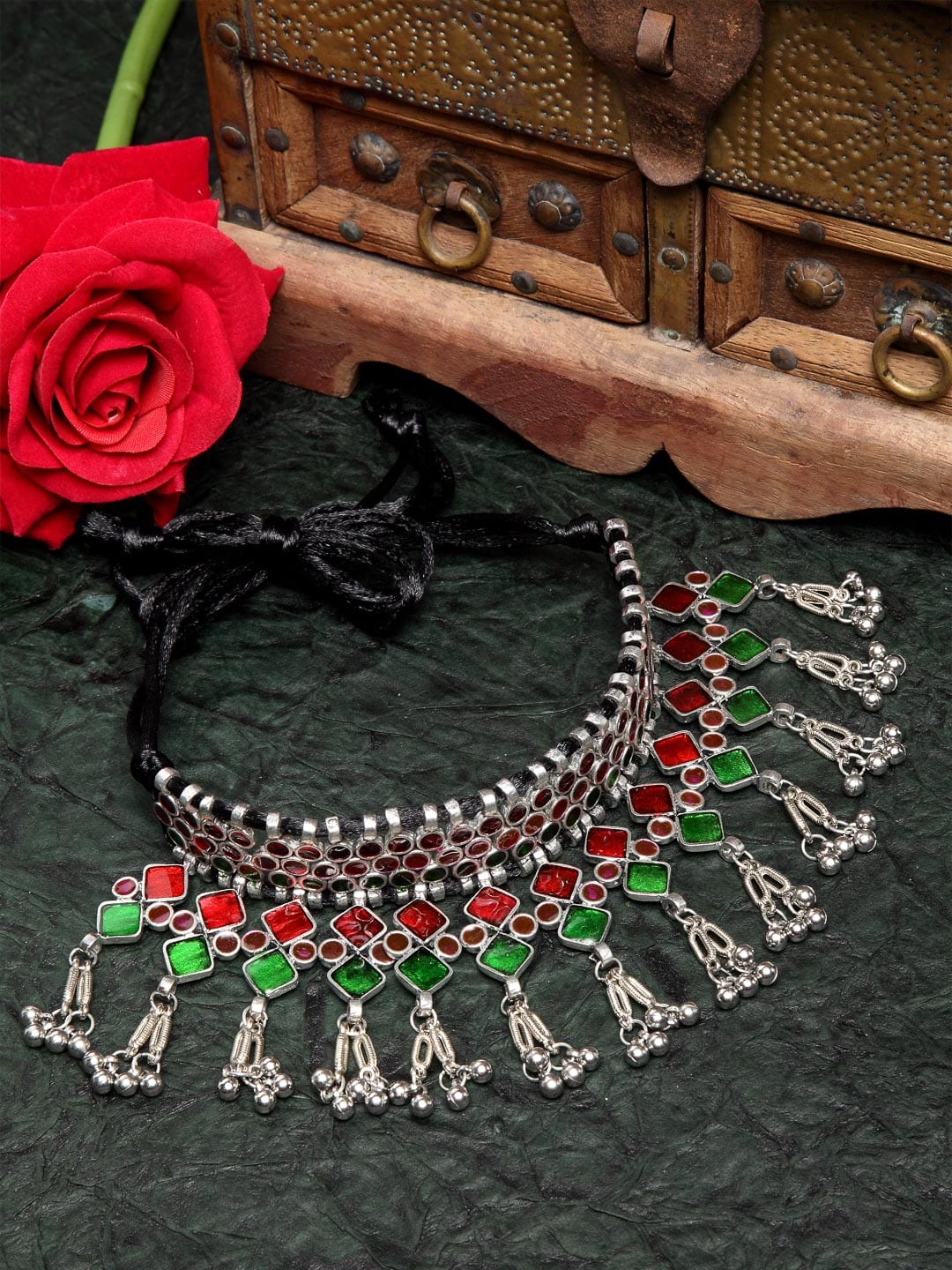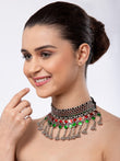 Handcrafted Green Red Meenakari Afghan Tasselled Design Oxidised Silver Plated Choker,