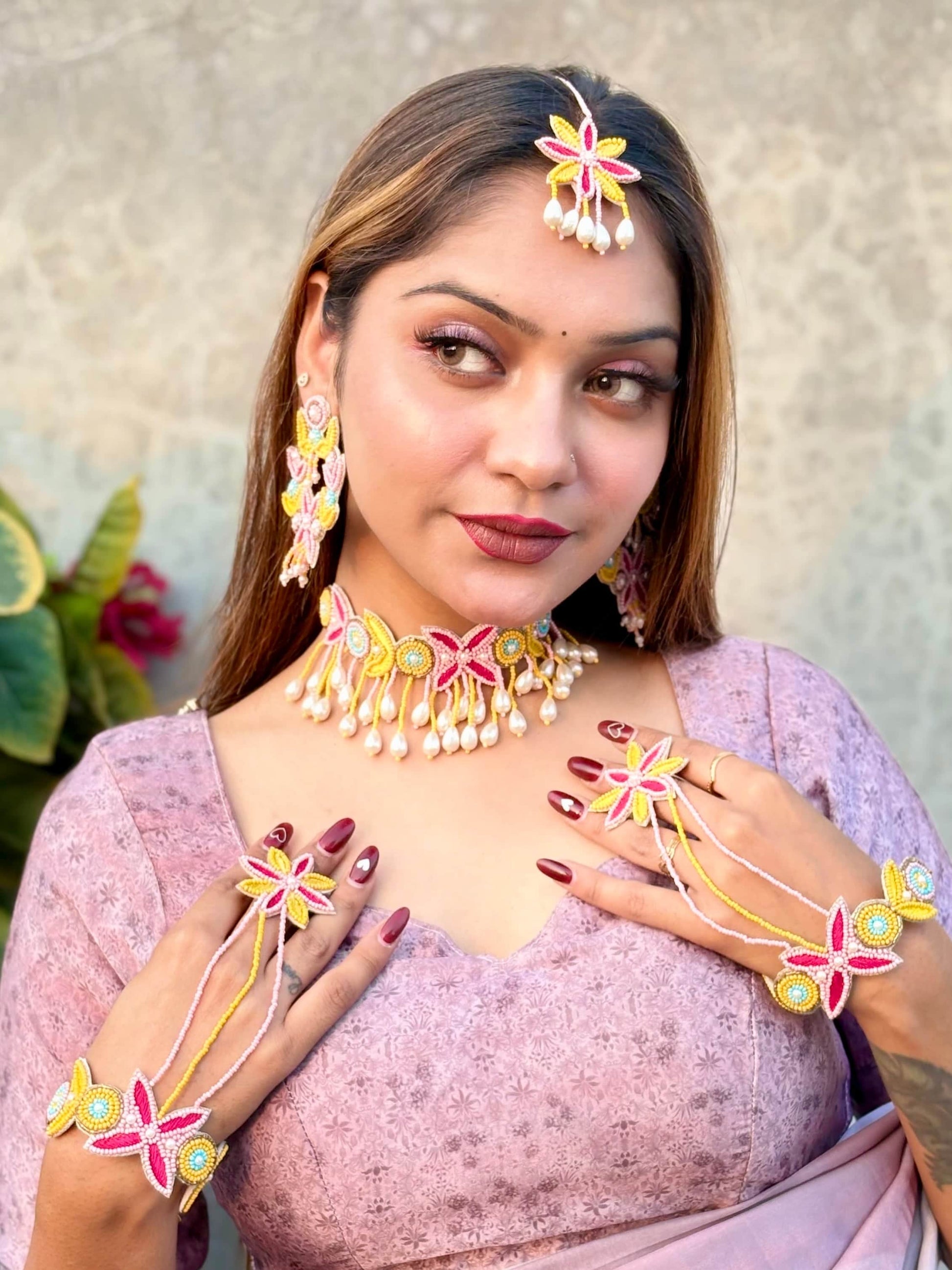 Step into the spotlight with this breathtaking, handcrafted jewelry set, designed to capture the elegance and vibrancy of a modern celebration. Perfect for Mehndi, Sangeet, Haldi, or festive occasions, this eye-catching ensemble beautifully complements traditional and contemporary attire.